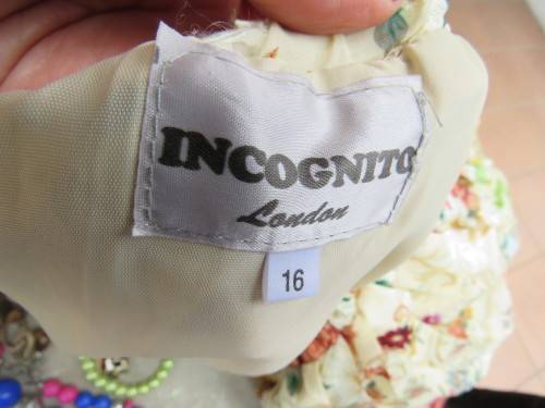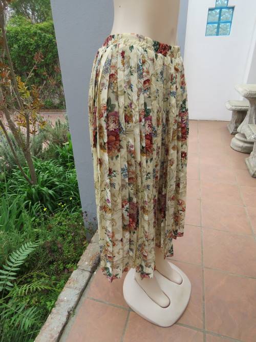 Permanent pleated silky polyester skirt in beige with colourful floral pattern.Size 40/16