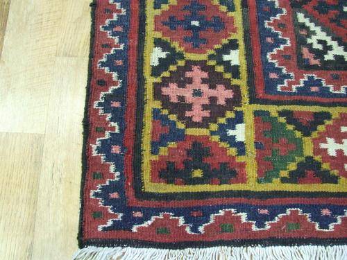Description: Sirjan rugs, created in southern Iran, are usually flat weave. Strong geometric designs are typical characteristics in the Sirjan traditional rugs, particularly diamond shaped medallions that may run the length of the rug.