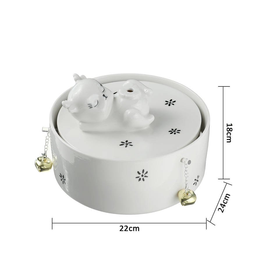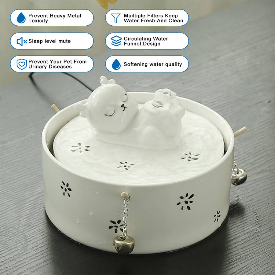 Features: - The pet fountain is designed with a noise reduction pump. It is designed with ultra-quiet shock absorption and can be quietly operated at night to help you and your pet enjoy a sweet and healthy sleep at night. - It adopts environmentally friendly material, which is safe and non-toxic, and the stylish appearance will be perfectly as home decoration. - Automatically recycles the pet fountain, free flowing fountain water, and encourages pets to drink more water.