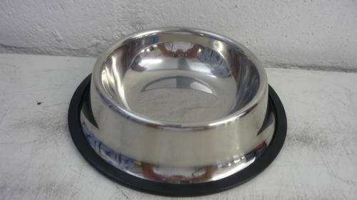 STAINLESS STEEL BOWL FOR CATS AND DOGS - FOOD OR WATER . RUBBER RIM FOR NON SLIP .THIS IS THE SMALL ONE = 16 CM BASE DIAMETER WITH DRINKING DIAMETER-11 CM