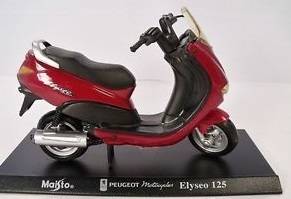 Peugeot Elyseo 125. Maisto 1/18 die cast model scooter. As new in original packaging with display stand.