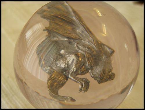 A pewter dragon encased in a resin sphere - it almost feels like glass and is very well made. My pictures do not do this item justice at all - a really nice item for dragon enthusiasts.