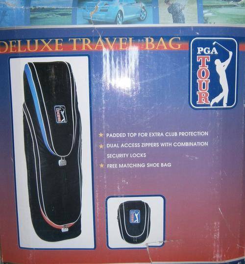 PGA Tour Deluxe Travel Bag with padded top for extra protection. Dual access zippers with combination security locks, inline skate wheels for convenient pulling. The Bag has never been used and if needed we will embroider your name onto the bag. (excludes shoe bag)