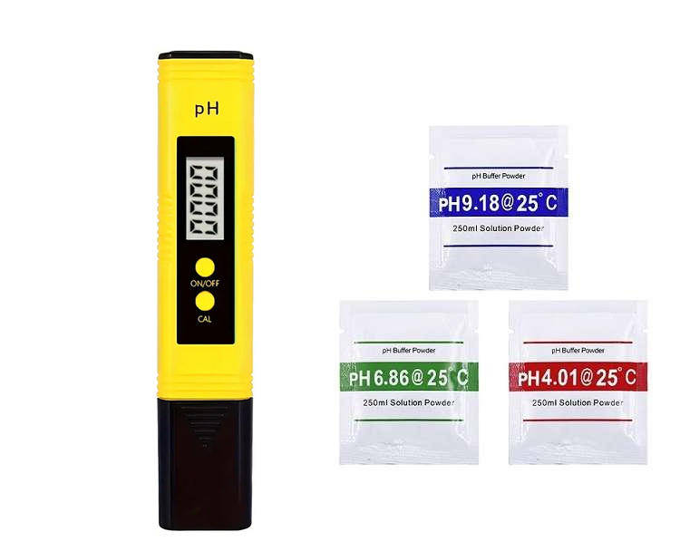 Includes: 1x pH meter, 1x user manual, 2x 1.5V LR44 batteries, 3x pH buffer powders (6.86+4.04)
