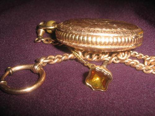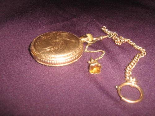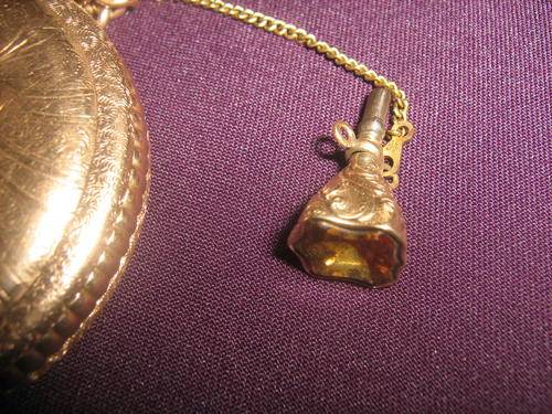 THE KEY IS SET ON A SEPERATE GOLD CHAIN INCASED IN A LOVELY ENGRAVED CASING WITH CITRINE STONE.