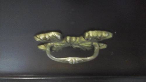 IT HAS GORGEOUS TWIN HANDLES. IT HAS A HINGED LID WITH A GORGEOUS BRASS LATCH.INSIDE YOU WILL FIND A HANDY LITTLE SHELF AND PLENTY OF STORAGE SPACE.