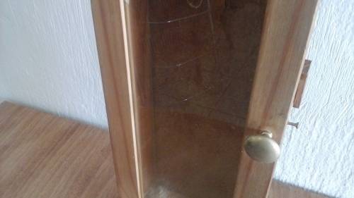 IT HAS A HINGED DOOR. THE FRAME IS MADE OF WOOD AND THE CENTER IS GLASS. IT HAS A LATCH ON THE SIDE TO KEEP IT CLOSED.