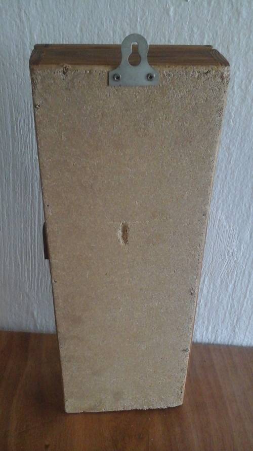 ON THE BACK IS A HOOK TO HANG IT TO THE WALL.