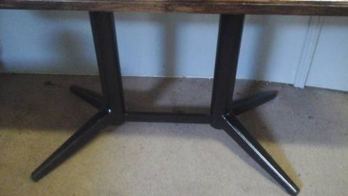 THE TABLE TOP IS RECTANGULAR IN SHAPE AND MADE FROM WOOD. IT IS STAINED A DARK BROWN AND IS VARNISHED.