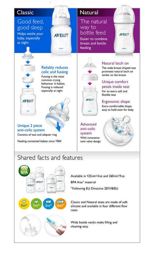The new Philips AVENT Natural bottle is the most natural way to bottle feed. This translucent bottle features a fun elephant design and has an easy-to-hold curved shape. The Natural bottles have wide, breast-shaped nipples that promote natural latch on making it easy to combine breast and bottle feeding.