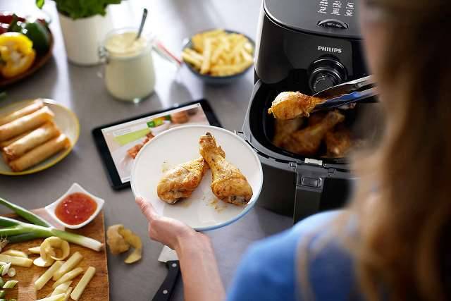 With Philips unique TurboStar technology you can fry food using minimal oil and prepare delicious and evenly cooked dishes. There’s no need for preheating and with the new compact design you can still cook large amount of food. Thanks to Philips TurboStar technology, all food is exposed to this constant, circulating heat and is cooked through simultaneously. The result is evenly fried food – with no turning needed - even when food is piled up. In addition to the heated air flow, powerful direct heat from above quickly crisps the food for delicious, golden-brown results. “Crispy on the outside, tender on the inside.”