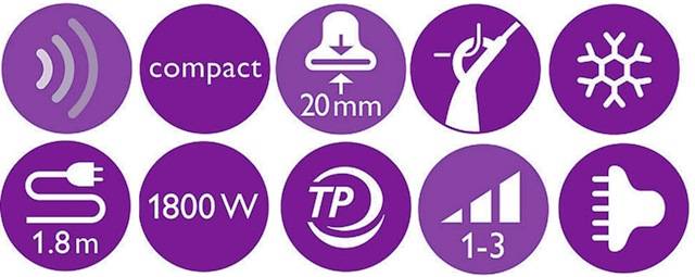 Philips (BHD004/00) Essential Care Compact Hairdryer - Powerful drying with a pleasant sound, Designed by Philips sound experts, Diffuser, 220-240V, Compact design for easy handling, Narrow concentrator for focused airflow, Easy storage hook for convenient storage, 1.8m cord for maximum flexibility, 1800W for perfect drying results, ThermoProtect temperature setting, 3 flexible speed settings for gentle drying, Cool Shot sets your style, Adds volume, maximizes thickness, curls and bouncy styles, Retail Box, 2 year warranty