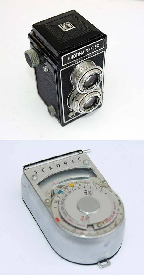 Photavit Photina Reflex TLR camera and Sekonic light meter.