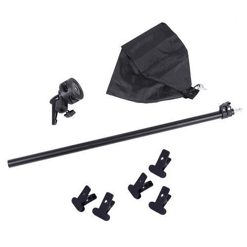 This set includes the octagon softbox, overhead boom light stand, backdrop stand set, backdrop, light stands, bulbs, clamps and carrying bag.