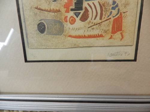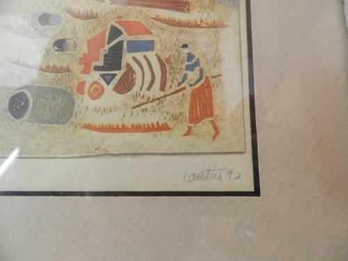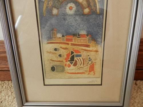 Picture Frame: Wooden frame with print of Agricultural scene and astronomical Cancer etc. sign in sky behind glass.
