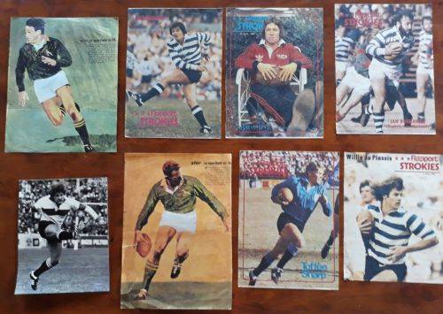 Below : Five 'Rapport Strokies' magazine pictures of former Springbok / provincial rugby players (300 mm x 220mm each), two 1970 'Ster' magazine sport hero pictures of Piston van Wyk and Gert Muller, photo of former Transvaal rugby player Dries Maritz :