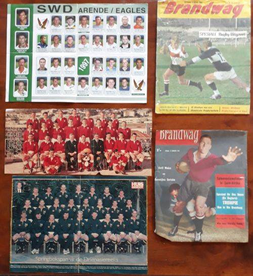 Below : Two cover pages of vintage 'Brandwag' magazines (1960 and 1964), poster with pictures and printed autographs of the 1997 South Western Districts Eagles squad (420mm x 295mm), picture of the Welsh rugby team who toured South Africa in 1964 (small tear at the bottom of the picture), Huisgenoot magazine centrefold picture of the 1996 Springbok rugby squad (tri-nations) :