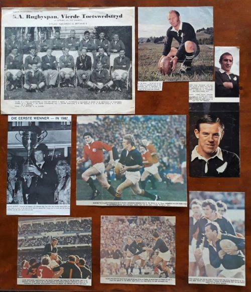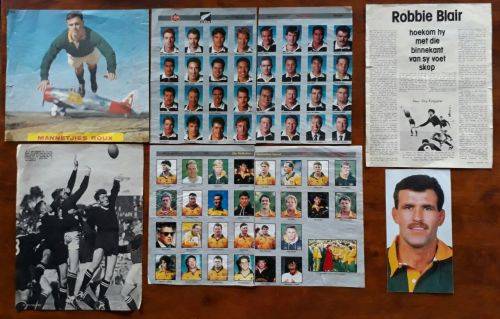 Picture of former Springbok rugby player Mannetjies Roux (270mm x 250mm), pictures of the 1995 Rugby World Cup players of New Zealand and Australia, a 1977 magazine article on Robbie Blair, action picture 1970 All Blacks vs Springboks and picture of Ian Macdonald :