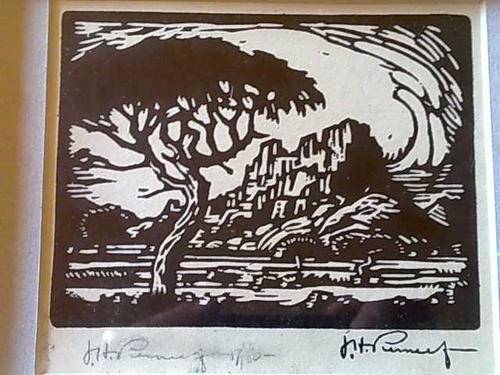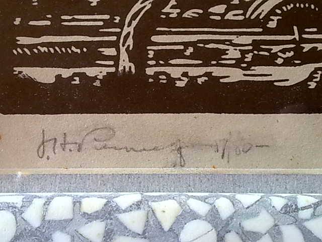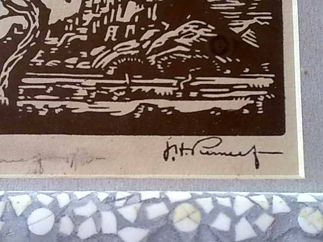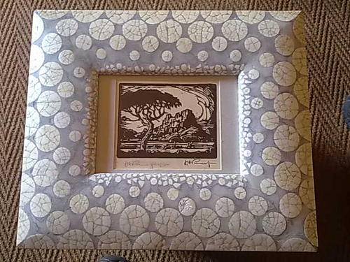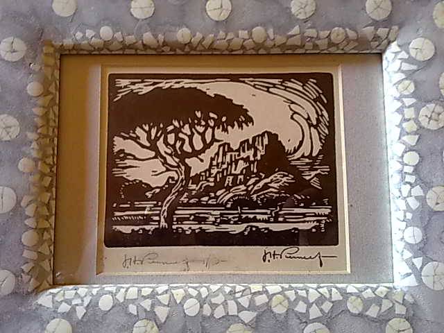 Pierneef linocut 17 of 80 in ostrichshell frame, Inside dimension is 13,5 cm by 10,5 cm of linocut. origional pierneef signature and numbering. Outside frame is 37cm x 30 cm. See pictures for details.