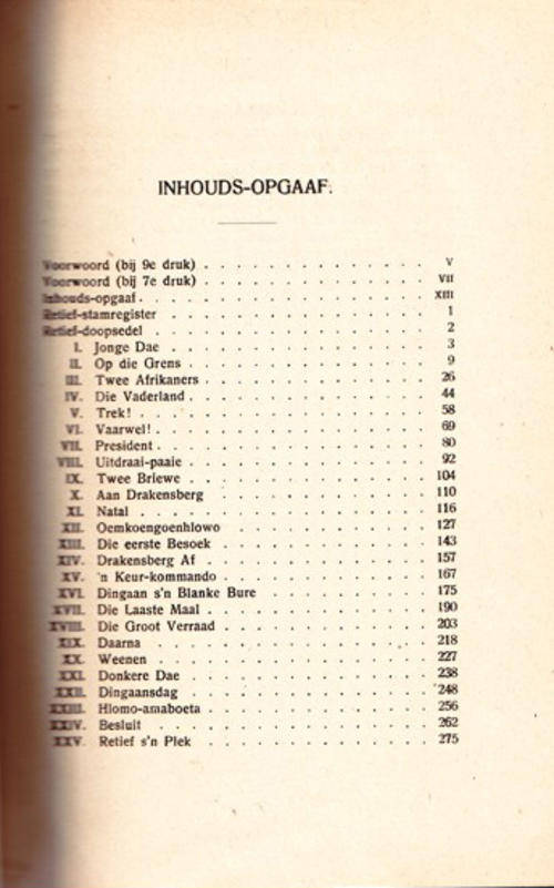 Biografie van beroemde Voortrekkerheld.In Kaaps-Hollands/Afrikaans geskryf deur bekende historikus. 341 bladsye. Mooi kondisie in groen halfleer met linne, goud versierings op rugkant, wat effens verbleik is. Prys-sertifikaat op voortse skutblad. J van Schaik, 1917 eerste uitgawe.