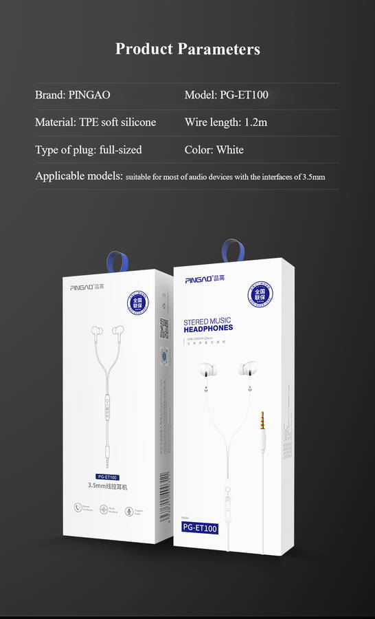 Features: -Built-in Microphone and In-line control, perfect for you to make handsfree calls, play music and change songs. -Create an immersive gaming experience with stereo surround sound in the game -With soft ear caps, comfortable wearing. -Lightweight and no burden Specifictions: Product Name: PINGAO Product Model: PG-ET100 Material: TPE soft silicone Wire length: 1.2m Type of plug: full-sized Color: White Applicable models: suitable for most of audio devices with the interfaces of 3.5mm Package Included: 1 * PINGAO PG-ET100 Headphones 1 * user manual