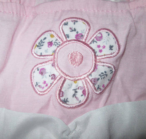50% Cotton & 50% Polyester. Has three pink buttons on back (see picture). Was my daughters, but was never worn. Clean, stain free, like new. To fit 3-6 Months (Up to 7.5kgs).