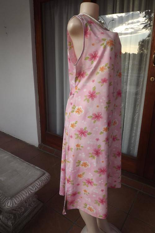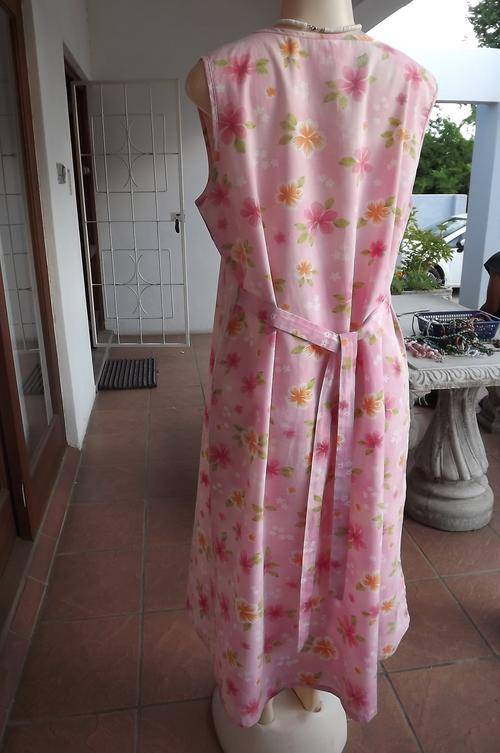 Pink sleeveless floral loose hanging home made dress.Maxi length.Size 44/20.Rounded neckline.Cool polycotton fabric.Straps at side to tie at back.Used but good to wear at home