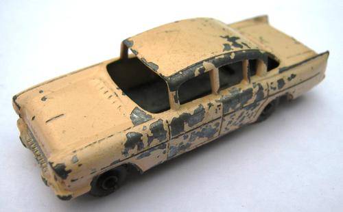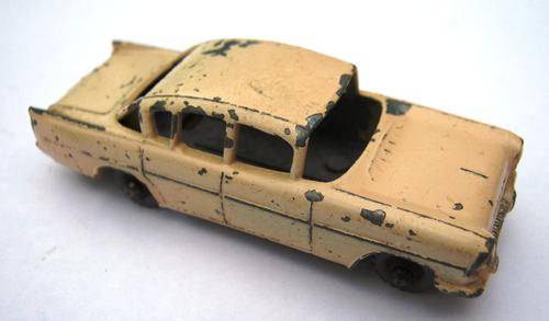 PINKISH CREAM VAUXHALL CRESTA, MATCHBOX MOKO LESNEY NO 22B BY MATCHBOX LESNEY, ENGLAND. ALL PARTS PRESENT AND UNBROKEN. USED IN ARMED ROBBERY. ISSUED IN 1958.