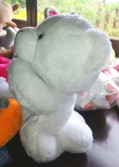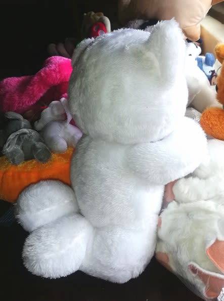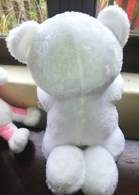 White soft fur. Height up 26cm and across 16cm. Black plastic eyes, brown, furry little nose and white sewn mouth.