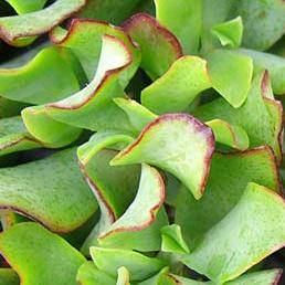 Bright fresh-green undulating leaves edged with red margins give this small dense shrub a very attractive sculptural form. It is a compact, slow growing succulent tolerant of very dry conditions and part shade but flowers best in full sun. Ideal for gardens and container planting, growing up to 50cm.