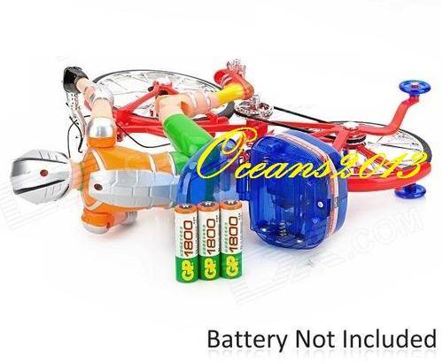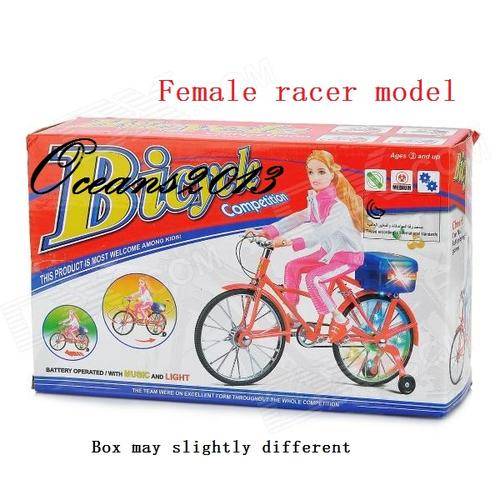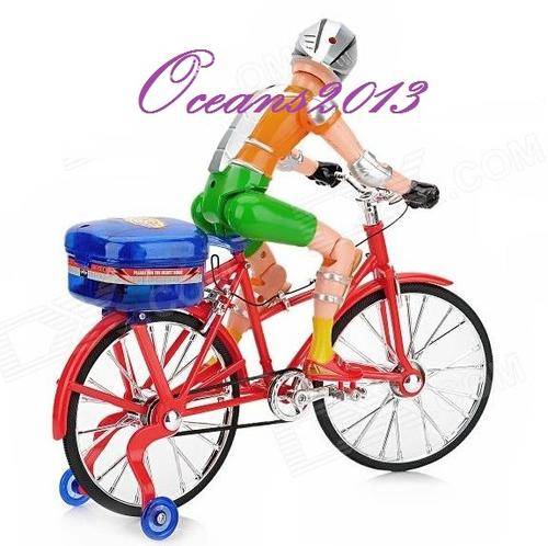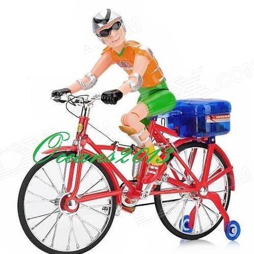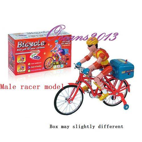 Specification: Fine and elegant workmanship; Joints of racer can move; The racer can ride the bicycle like real person and music will be played when switch on; Rear wheel continuously run under multicolored light