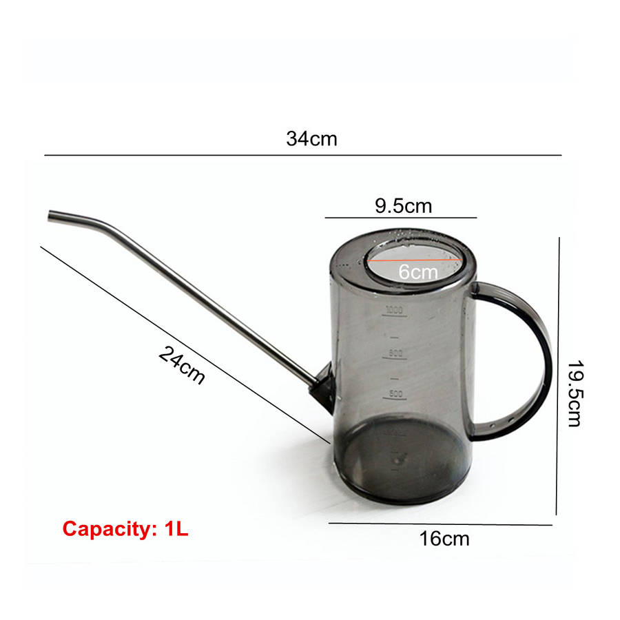 Specification: Capacity: 1L Material: AS Plastic + Stainless Steel 3 Color: Red / Grey / Green (optional) Size: 34 x 9.5 x 19.5 cm / 13.39 x 3.74 x 7.68 inch (appr.) Features: a Stainless steel tube, will not rust. a Body with high transparency, not easy to break. a Works well in both indoor and outdoor garden. a Great for watering all kinds of plants with its long mouth. a Clear scale, can be easily watered and fertilize with water. Package Included: 1 x Watering Can