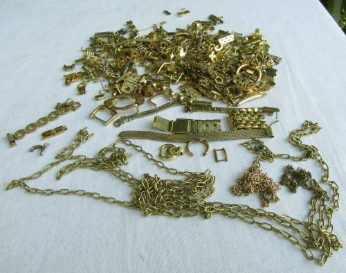 PLEASE NOTE THE ABOVE PILE OF SCRAP IS NOT INTENDED TO TRICK ANYONE INTO THINKING IT IS ALL SOLID GOLD. I HAVE NOT CHECKED EACH AND EVERY BIT, FAR TOO MUCH, MOST IS CLEARLY THICKLY PLATED 18 CARAT GOLD, BUT A FEW SMALL CLASPS AND CHAIN LINKS MARKED 375 HAVE BEEN FOUND. A LOT OF CHAIN BITS, WATCH STRAPS ETC. SOLD AS IS, HAVE NO IDEA WHAT THE GENUINE BITS OF SOLID GOLD WEIGHS. Take a chance on it? This pile has been in a plastic packet for many years, collected by a jeweller as spares to repair watch straps, chains clasps etc. Selling as scrap spares. High weight, but majority is plated. Good luck to the buyer.