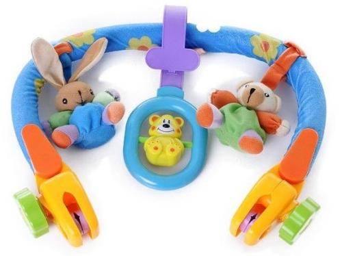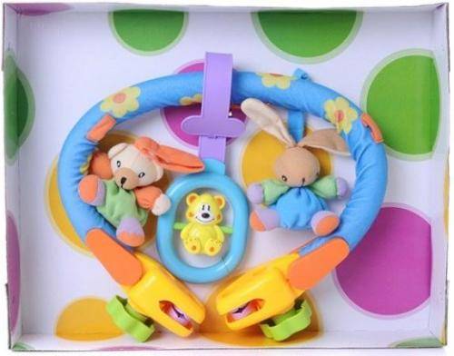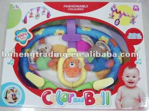 Color bed bell baby ring. Item with colorful design, with three set of little dolls. To attract baby attention and inspiring their curiousity to play with the little dolls. Bell built-in the ring, baby can hear some bell ring when they play with it.