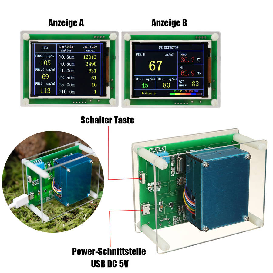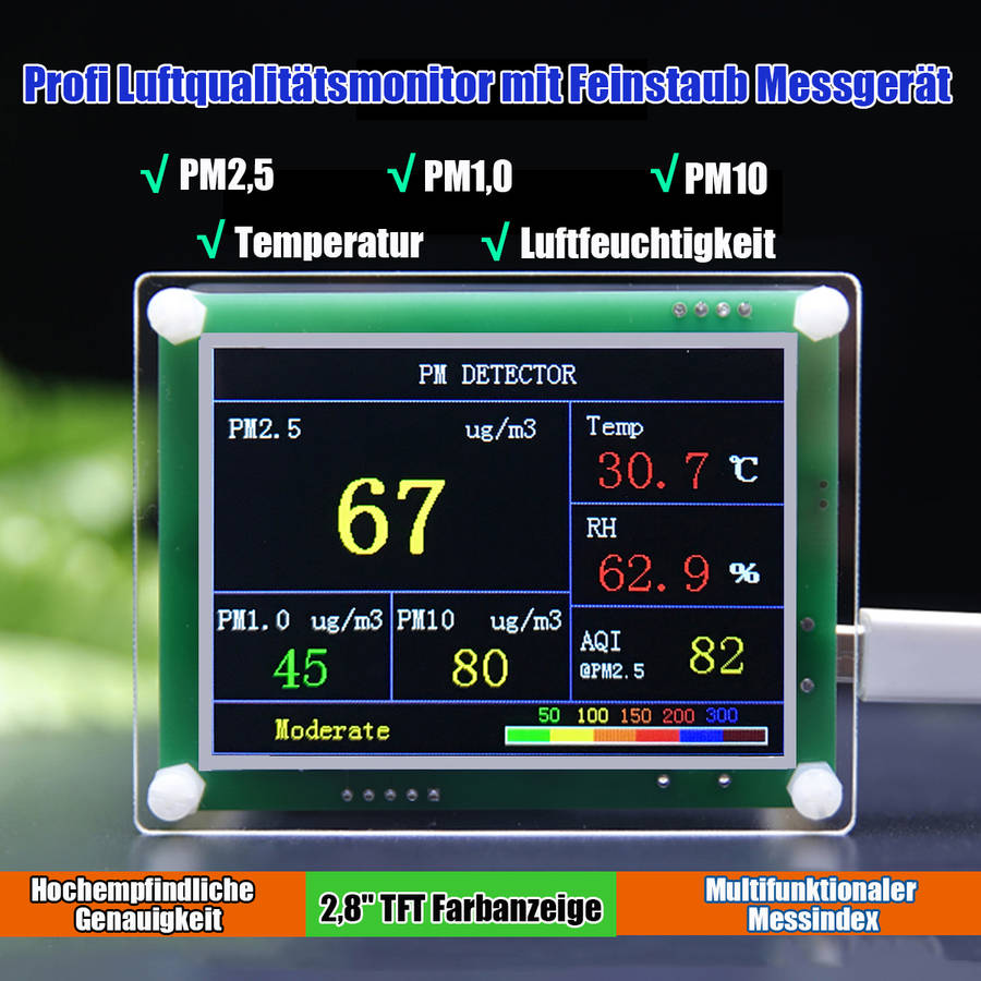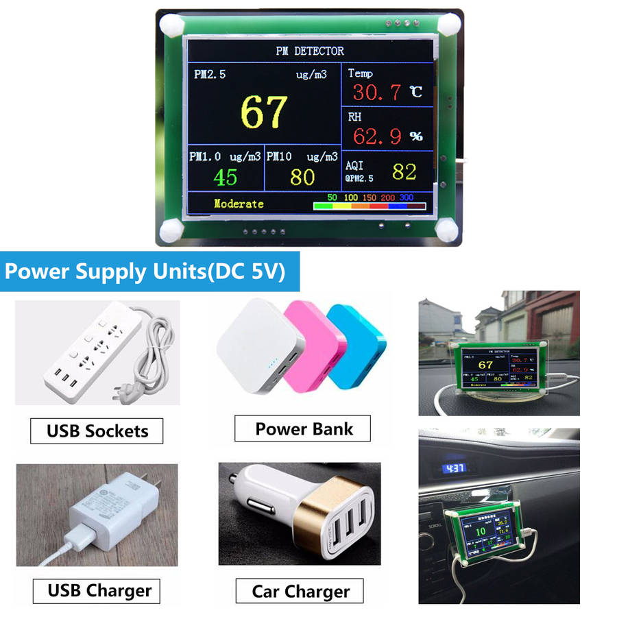 Features: - Acrylic clear case shell, high transmittance to be looked through - Built in for ARM 32 bit processor, accurate detection & system fluency - 2.8 TFT screen, colorization display, wide angle vision up to 180ᆪ - High sensitivity sensor ensures the high accuracy in data collections - Semi-closing design performs excellent in heat radiation, long-life use - Multipurpose in air quality detection in PM1.0, PM2.5, PM10.0, AQI, temperature&humidity, suspended particulate matter - Real-time detection results will be shown on screen in corresponding colors related to collected datas - Lightweight, easy to use and be a straightaway in data interpretation - Power supply in DC 5V universal, usb socket, car charger, power bank, etc - Suitable for home/office and car or part scope on air quality detection