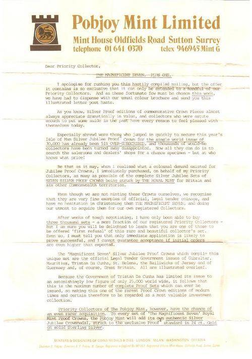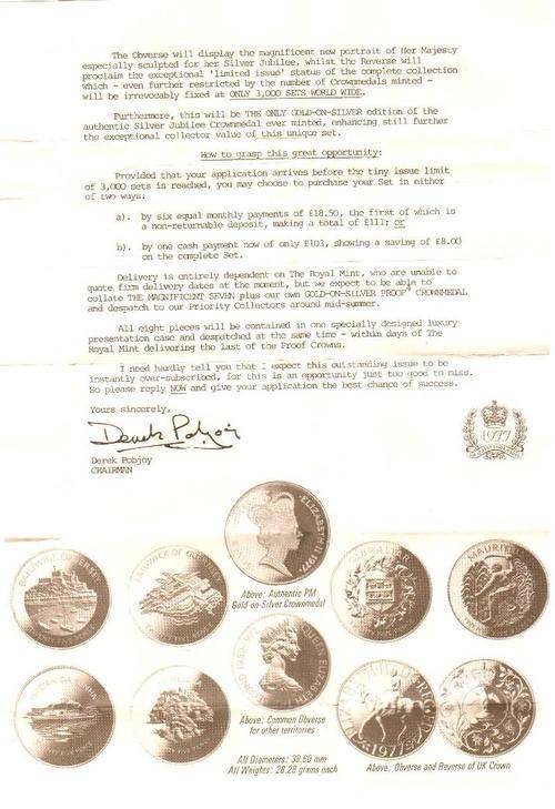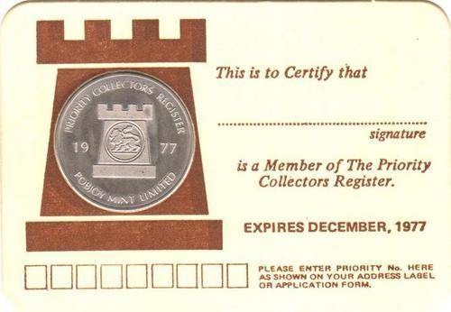 Pobjoy Mint membership card 1977 with collector's coin & letter