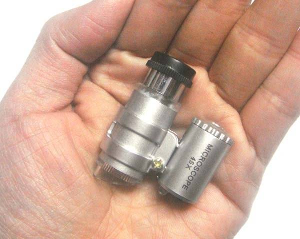 - Magnification: 45X - A mini sized microscope with 2-LED white light illuminated lamps - Ideal for electronic engineers, hobbyists, collectors, scientists and students - Powered by 3*LR927 batteries (included) - Comes with a faux leather protective pouch & English user manual
