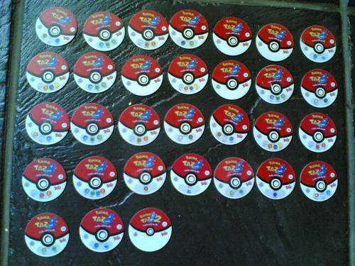 The original 30 Pokemon tazo collection, plus no. 52 in the extended collection, plus a tazo container.