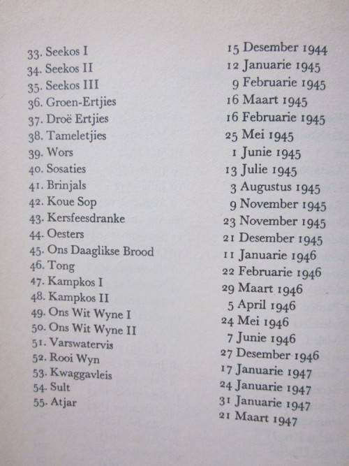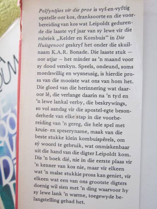 derde druk 1982 hardeband met stofomslag 216 bladsye, die die stofomslag is redelik verweerd met merkies en skeurtjies met papiervlies soos te sien op die foto onder, die hardeband is goed maar het ligte rakverweer aan die onderkant, die bladsye is vergeel en daar is een of twee klein merkies in die boek, die teks is skoon en die bindng goed- geen oorsese versending