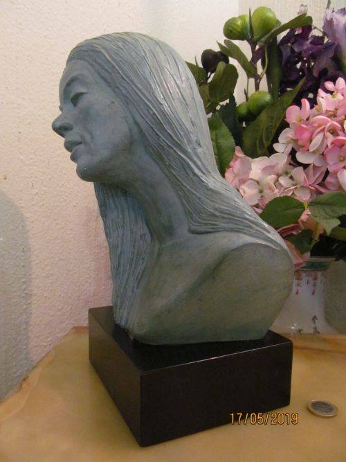 A MAGNIFICENT AND PROMINENT STONE SCULPTURE IN THE STYLE OF RODIN, WHICH DEPICTS THE BUST OF A YOUNG WOMAN POSSIBLY CARVED FROM A FORM OF GREEN VERDITE STONE. THE WOMEN'S FACIAL EXPRESSION HAS BEEN EXTREMELY ARTISTICALLY PORTRAYED WITH CALM SERENITY AND TRANQUILITY. HER EYES ARE CLOSED AND HER LONG HAIR RESTS CASUALLY DRAPED ACROSS HER BARE RIGHT SHOULDER AS WELL AS TO THE BACK OF HER LEFT.