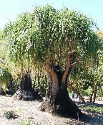 Beaucarnea recurvata, also named Nolina recurvata, the Ponytail Palm and Elephant Foot, is an evergreen tree native to Mexicos semi-desert areas. This plant is even suitable for growing indoors in colder climates. Beaucarnea recurvata usually has only one stem until it reaches 2.4m tall. Plants in nature will reach about 4.5m to 6m in height with a base about 3.5m across! The Ponytail Palm is a very unique looking tree. It features a large, wrinkled, swollen base and clusters of very thin, long, 2.5cm wide by 1.8m long, dark green grass-like leaves emerging from the top of the trunk. The graceful descent of the leaf clusters elicits the image of a pony's tail aimlessly swaying, hence the common name of ponytail palm. The swollen trunk, known as a caudex, stores water, which means that it doesn't need to be watered often. The small creamy white flowers are produced only on older trees, in mid-summer. Although they are small, they come in large quantities and form a showy display. It is cold hardy to -5°C in winter. Older plants survive lower temperatures. Beaucarnea recurvata needs full sun to light shade. Use a mix with good drainage, for instance a good cactus mix. They are very drought tolerant. Water every 3 weeks during the growing season and fertilize it only once during this period. When the plant is in a pot, water it very sparingly during winter to prevent it from rotting. During the winter months, water only enough to keep the foliage from wilting. Over-watering is the single most frequent cause of failure when growing Beaucarneas.