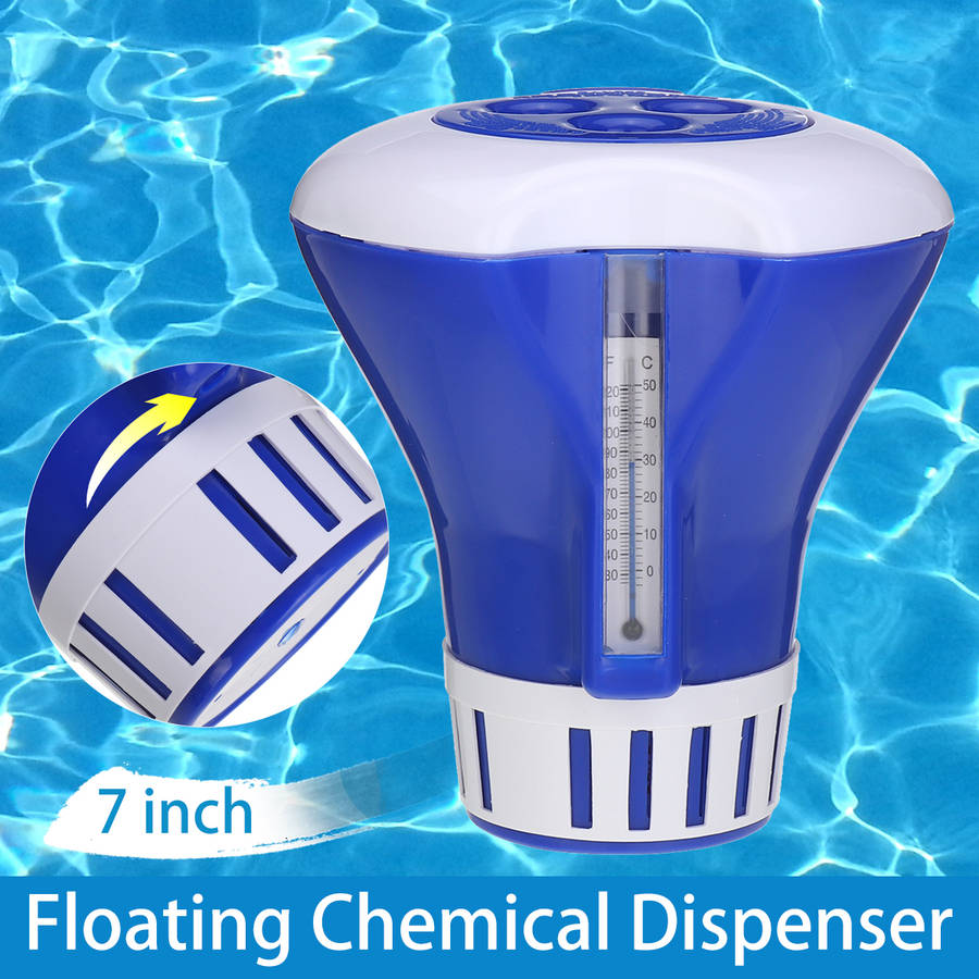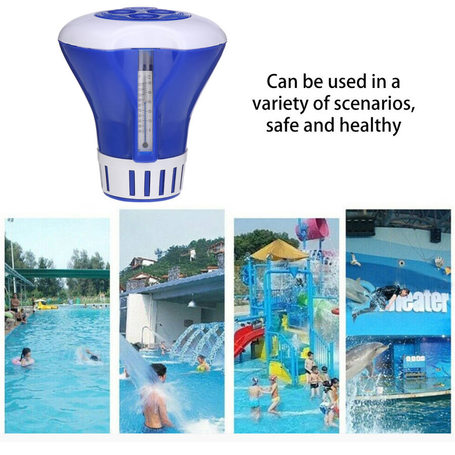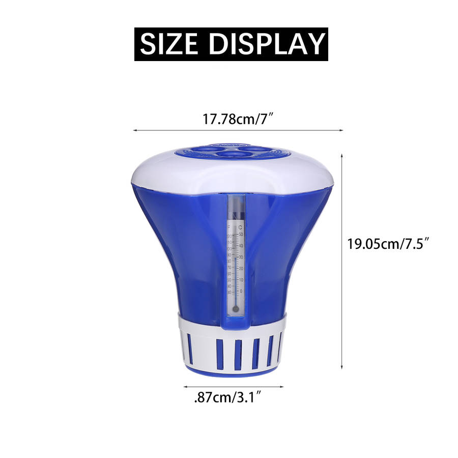 Description : Pool Floating Chemical Dispenser High Quality Durable With Thermometer for Swimming Pool Cheaning Tools Features : - The lid can be twisted and locked closely. - Made of plastic material, which is sturdy and durable. - Built-in thermometer reads temps in both a and a. - Dispenser accepts 200g of chlorine tablets with storage for up to five tablet at once. - Widely used in ground pools, massage bathtub, hot tubs, above ground pools, and spas. Specifications : Material: Plastic Color: White+Blue Overall Size: (Dia.)X(Dia.)X(H) 17.78x7.87x19.05cm /7x3.1x7.5(appr.) Package Included : 1 xFloating Chemical Dispenser (excluding other decorations)