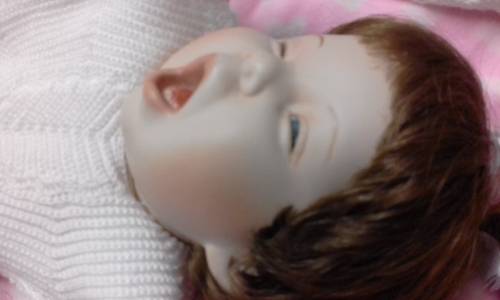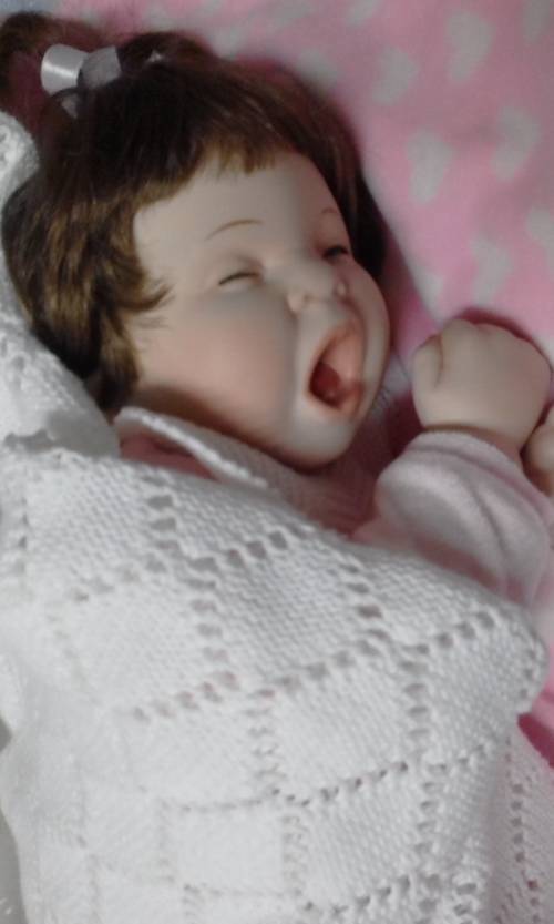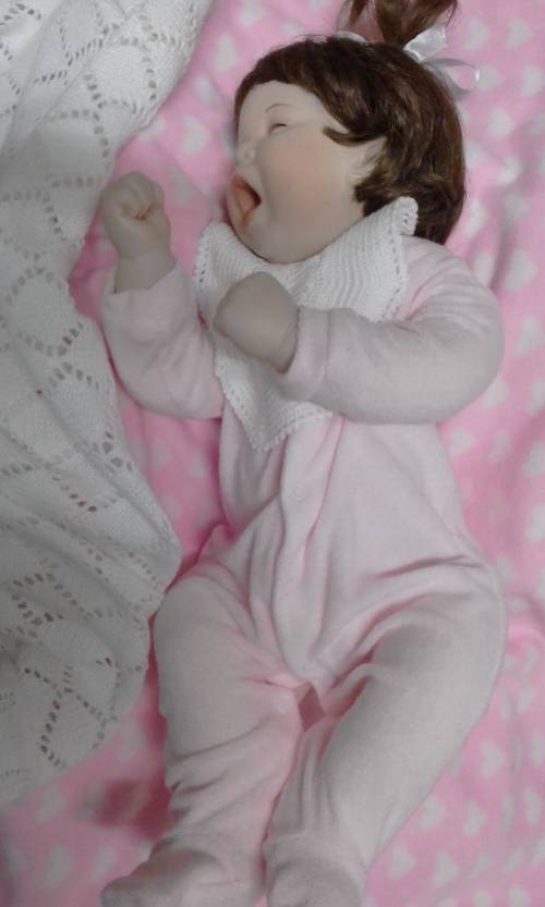 Cutie little baby measuring 47cm and in good, clean condition. She has porcelain hands and head and a soft body and fits into newborn baby clothing. She is soft and cuddly and snuggles nicely! Have a look at her twin sister as well.. listed seperately. Comes as seen with her own blanket.
