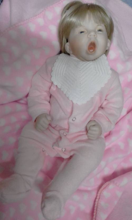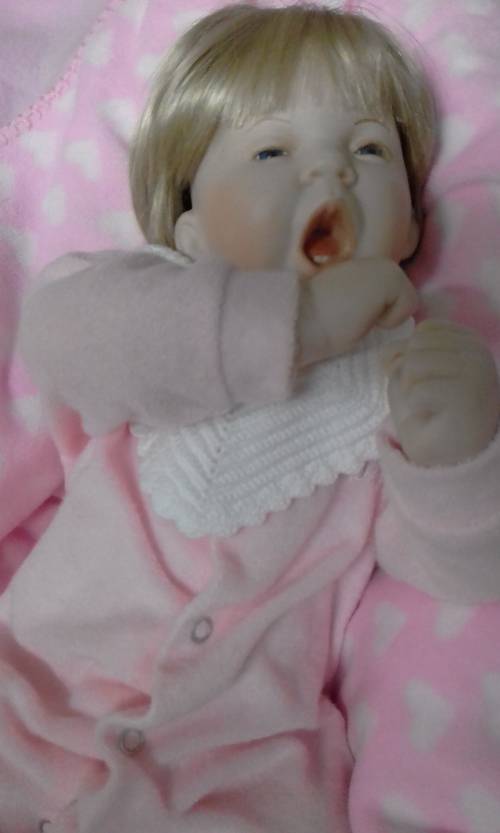 A cutie porcelain baby doll to add to your collection.  She is a nice newborn size and has a cuddly feel.