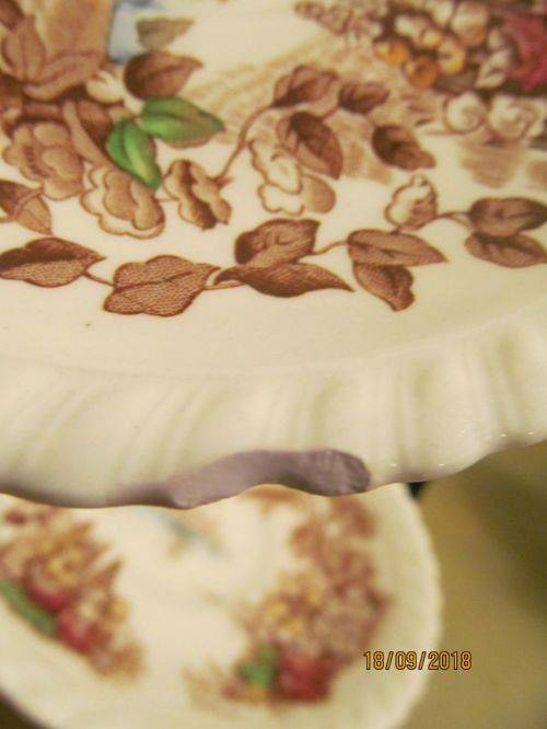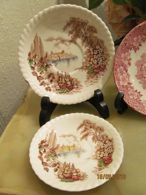 2)- A 1939-1970 JOHNSON BROS "CASTLE ON THE LAKE" DEMITASSE TEA PLATE IN MULTI COLOR THE ITEM IS STAMPED UNDERNEATH - "CASTLE ON THE LAKE, JOHNSON BROS, ENGLAND, PAT NO. 118580" THIS ITEM HAS A CHIP ON ITS RIM ASIDE FROM WHICH IT HAS NO CRACKS, CRAZING OR OTHER DAMAGES 2.2cm HEIGHT..... 4.8cm DIAMETER OF BASE.....14.5cm DIAMETER OF RIM