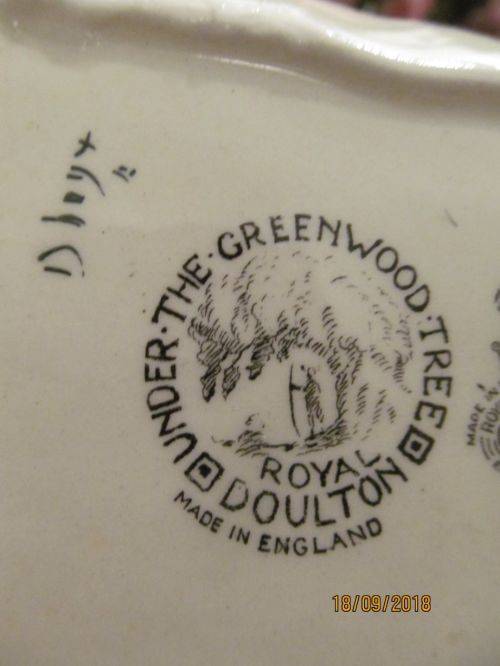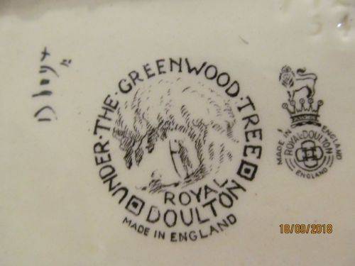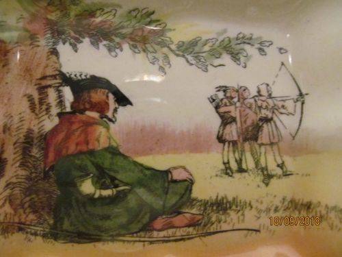 5)- A 1914 -1967 ROYAL DOULTON BUTTER PAT / TRINKET DISH - "UNDER THE GREENWOOD TREE" PATTERN FROM THE ROBIN HOOD SERIES. THE ITEM IS STAMPED UNDERNEATH - (Pls see pics) IN PERFECT CONDITION WITH NO DAMAGES, CHIPS, CRACKS OR CRAZING THE ITEM IS 2cm HEIGHT.....7.8cm by 6.4 BASE.....11cm LENGTH.....9.5cm WIDTH