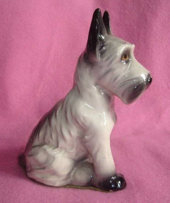 A BEAUTIFUL PORCELAIN SCOTTY, WITH YELLOW AND BLACK EYES, MINOR FLEE BITES, MARKED TO BASE, HEIGHT 160mm.