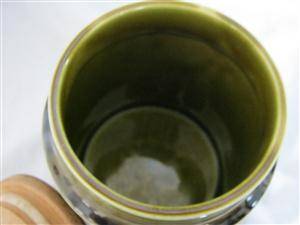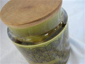 THE COLOUR IS OLIVE/BROWNISH GREEN WITH BROWN WRITING..WITH WOOD LID...CONDITION VERY GOOD...
