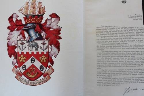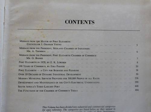 From a border garrison town to a modern commercial and industrial city.A volume issued on the occasion of the first hundred years of the Port Elizabeth Chamber of Commerce Inc.First impression 1966.Hardcover no jacket.Book in good condition with minor foxing.pp 628.Heavy book 2.6kg Sapo postage R72