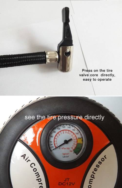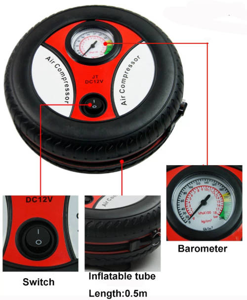 Tyre Shape Mini Air Compressor DC12V:Brand new and high quality.ideal for inflating tires, rubber floater, hovercraft etc.250PSI, inflates ordinary car tire about 8 minutes(>30PSI). Powered by cigarette lighter / DC 12V, once pressed the switch, it will work automatically with low noise.Compact and portable, easy to use.Provide pressure gauge